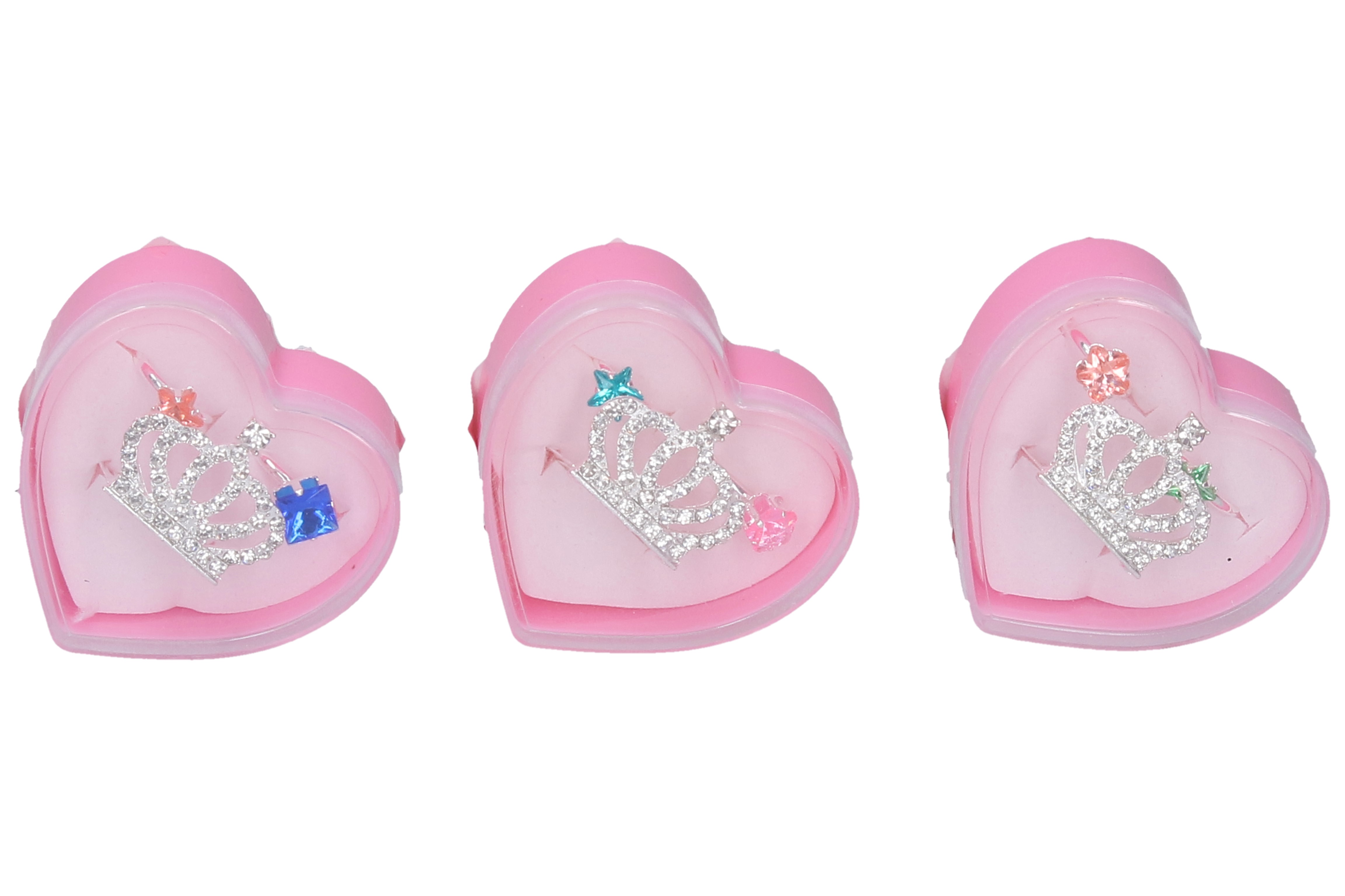 Prstýnky v krabičce, set. Balení obsahuje 3 prstýnky, 1 s kamínkem, 1 s perlou, 1 sponka s korunkou.