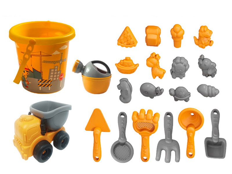 Sada na písek 21 ks. Obsahuje auto, kyblík, konvičku, 12 formiček, sítko, lopatky, hrabičky.