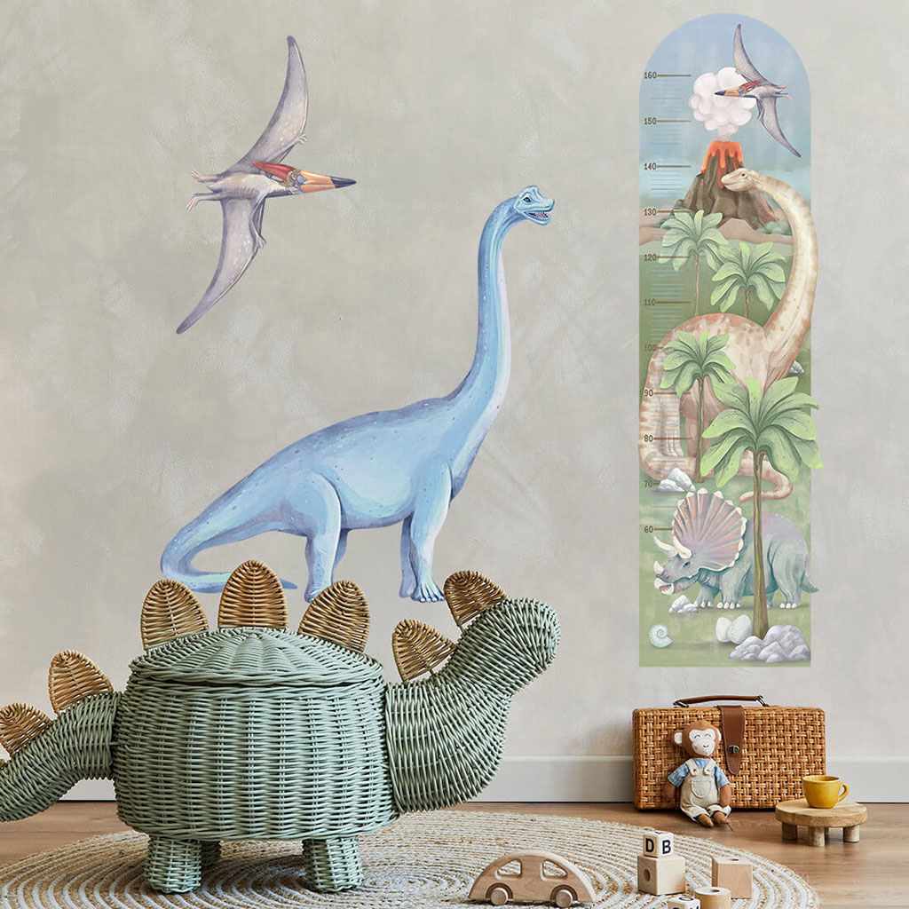 Lepa nalepka za steno Dino - merilo višine. Označevanje višine otrok v vsakem naslednjem obdobju njihovega življenja je tradicija, ki se prenaša iz generacije v generacijo. Ponujamo vam edinstvena merila višine v obliki nalepk, ki jih lahko nalepite kamorkoli in zabeležite vsak nov centimeter višine vašega otroka. Z izbiro dinozavrov za višino in dodajanjem drugih nalepk na steno boste svojemu otroku ustvarili edinstveno sobo. Nalepka je zaščitena s posebnim mat laminatom, ki jo ščiti pred praskami pri vsakodnevni uporabi in hkrati olajša lepljenje – folija je debelejša in se lažje prenaša na steno. Če iščete popoln način, kako oživiti otroško sobico, so naše stenske nalepke prava izbira. Naročite jih še danes in razveselite svojega otroka. Višino lahko označite od 50 do 160 cm. Dimenzije nalepke: 42x147 cm. Natančne dimenzije vsakega dela nalepke so navedene na zadnji fotografiji.