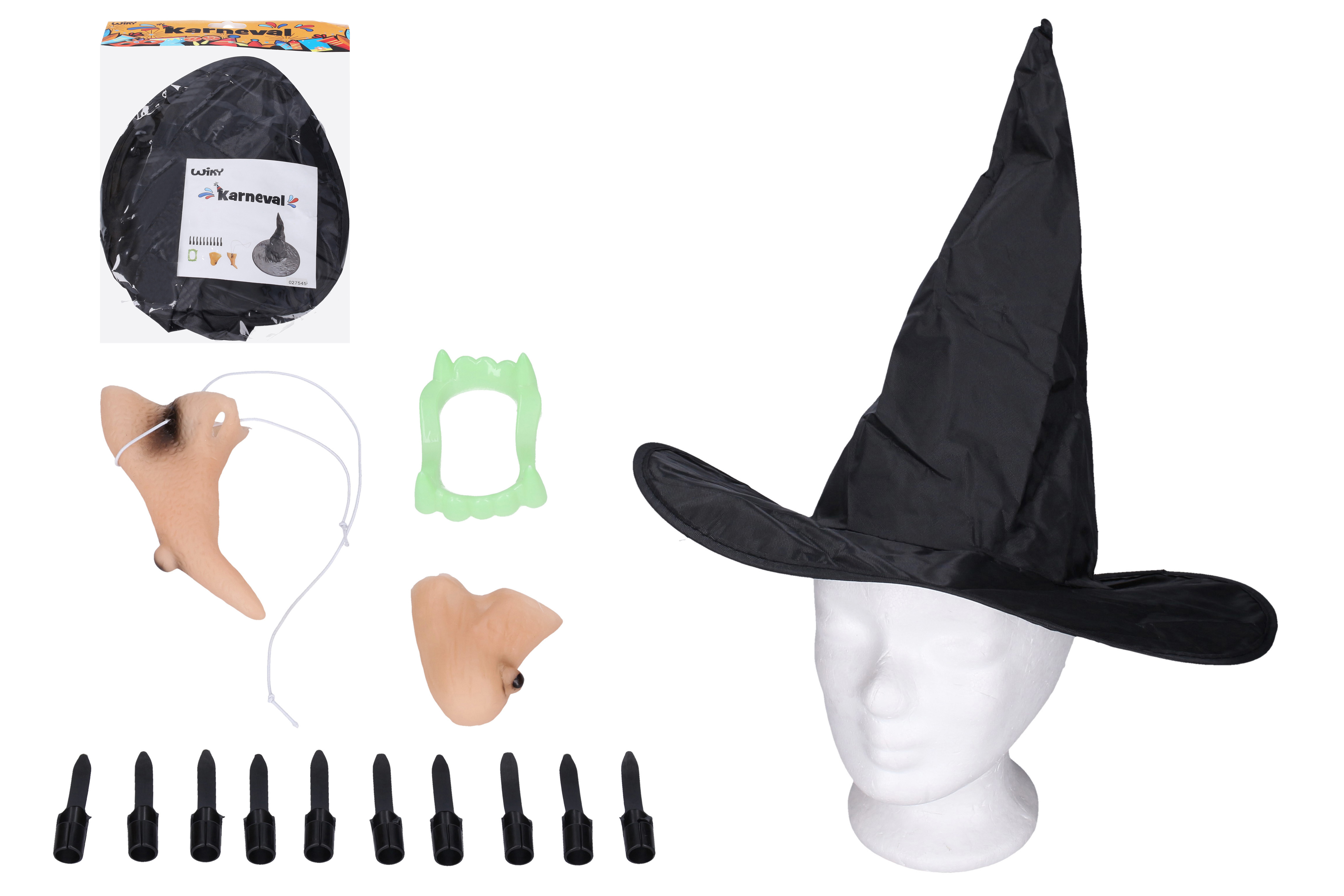 Set obsahuje: bradu na gumičce, nos na gumičce, 10 nasazovacích prstů s nehty, zuby a velký čarodějnický klobouk