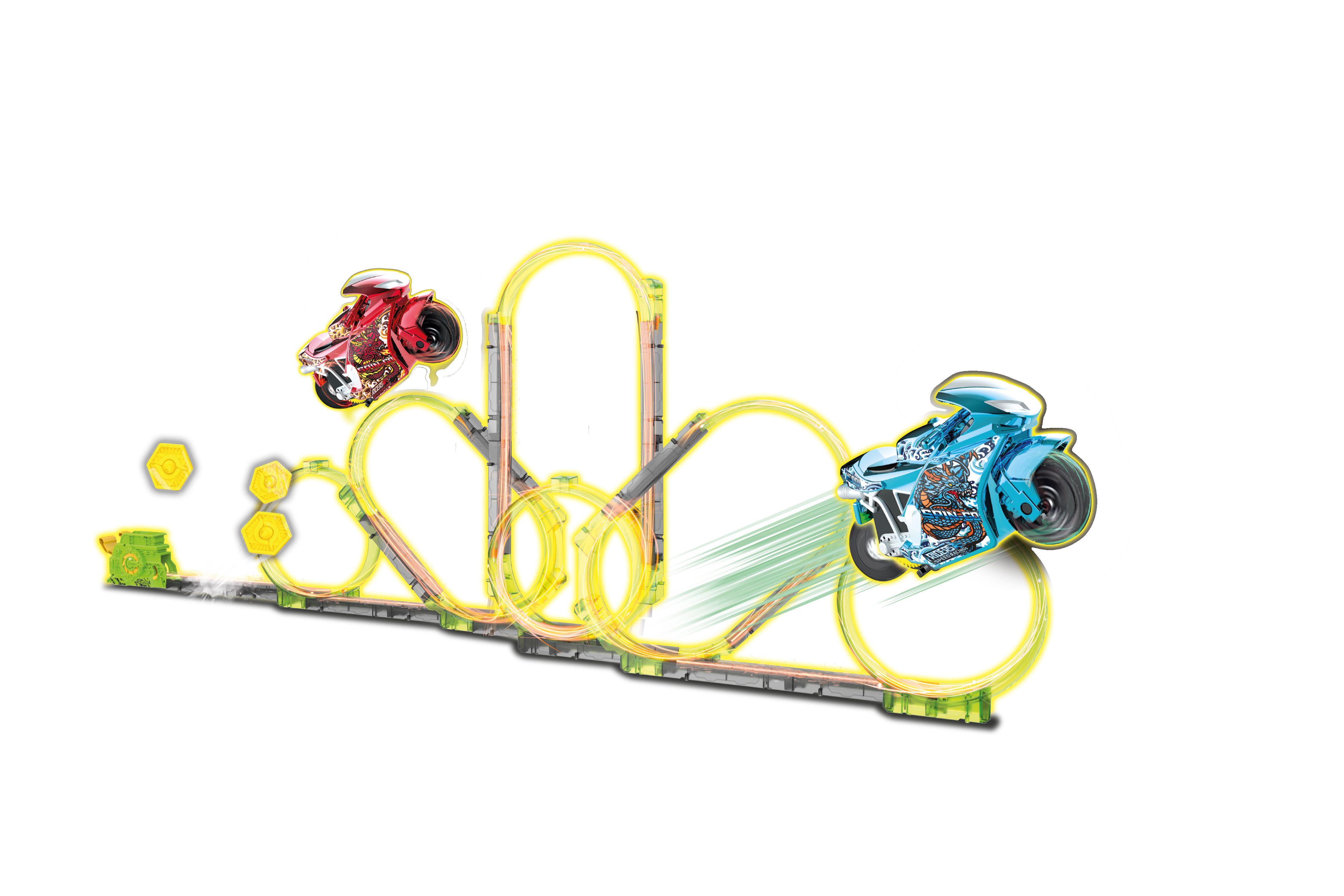Spin and Build Super dráha s 2 motorkami. S vystřelovacím zařízením. Dojezd motorky 50 m, na setrvačník s gyroskopem. Velikost motorky 4,5 cm. Další motorky lze zakoupit samostatně (W037920, W037921).