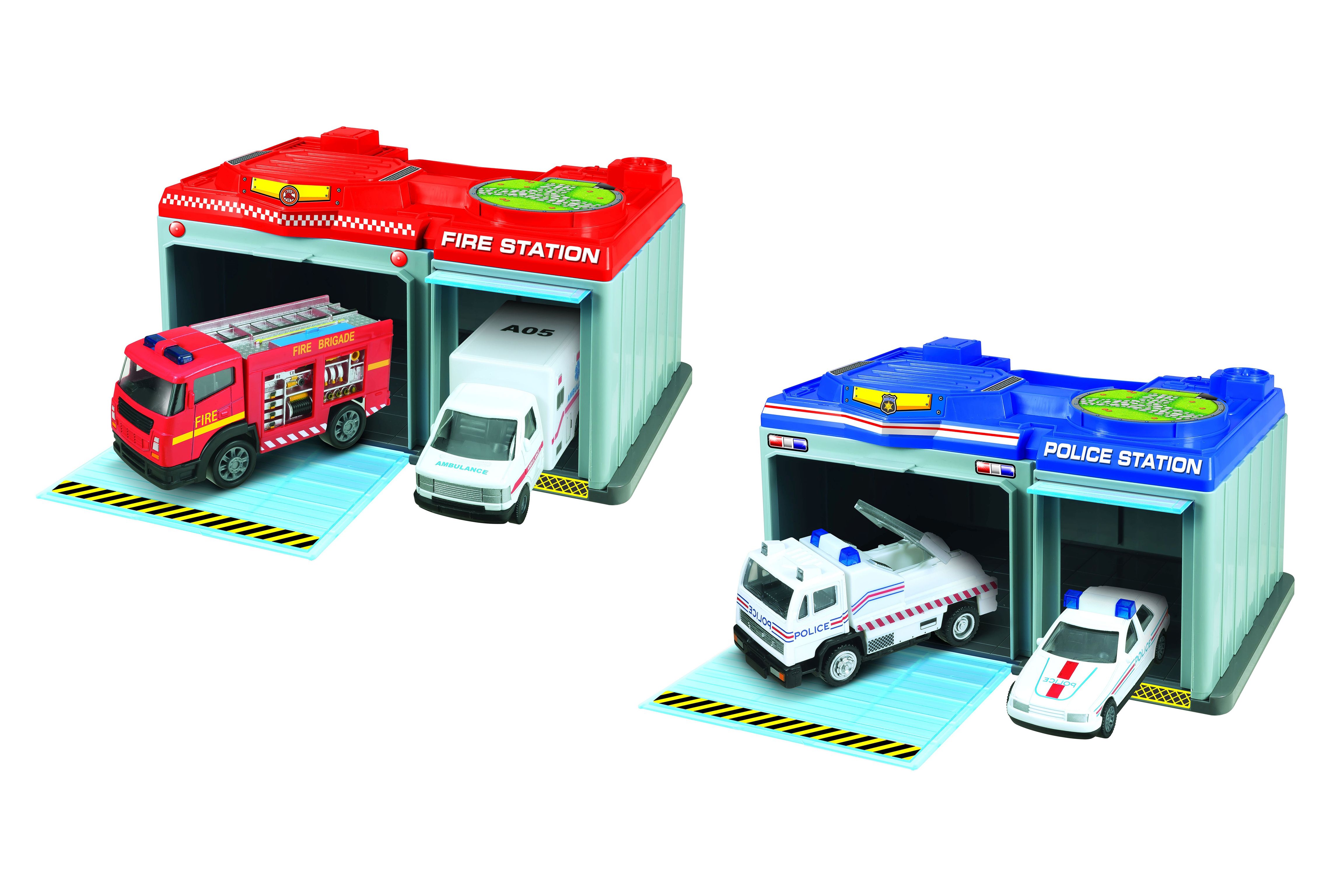 Stanice přenosná se 2 kovovými auty. Rozměry stanice 24x15,5x12,5 cm, velikost aut 13 cm. Materiál aut kov/plast. 2 varianty - hasiči, policie.