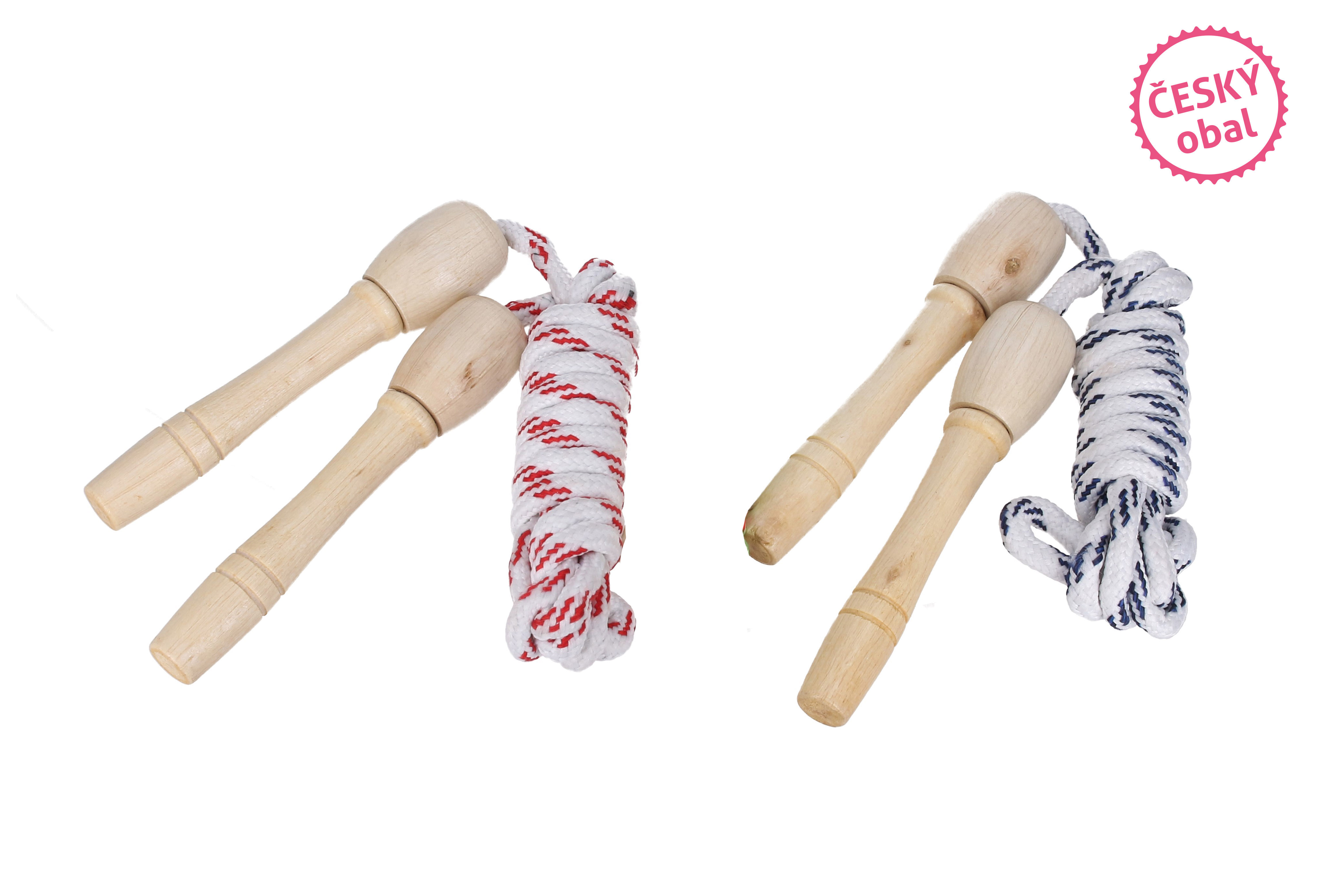 Švihadlo. Délka 220 cm. Dřevěné držadlo ergonomické. 2 varianty - modro-bílé, červeno-bílé.