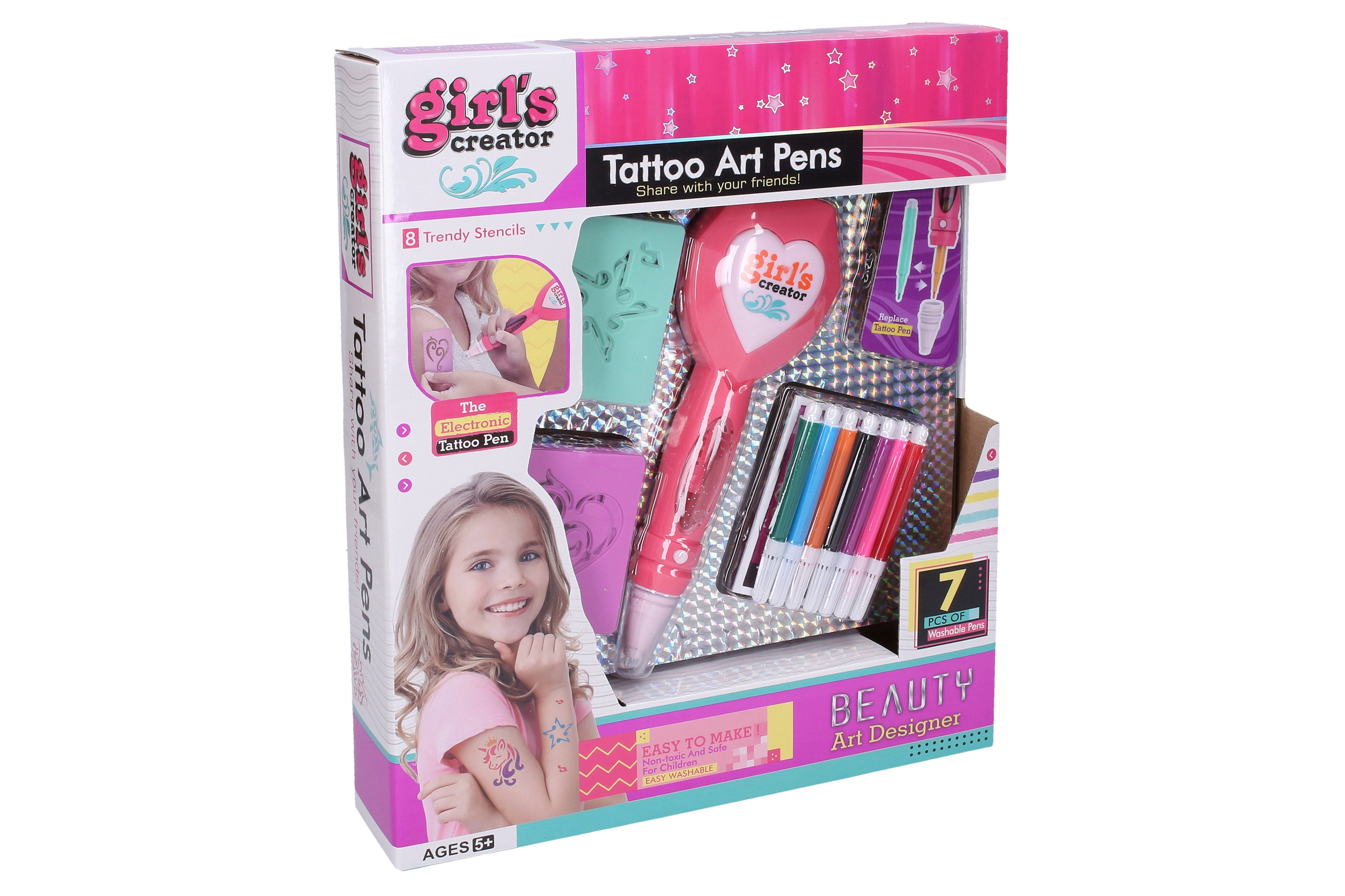 Tetovací studio set. Obsah balení - sada 8 šablon, 7 fixů, elektrické tetovací pero. Fixy jsou omyvatelné. Pero - 2xAAA, nejsou součástí.