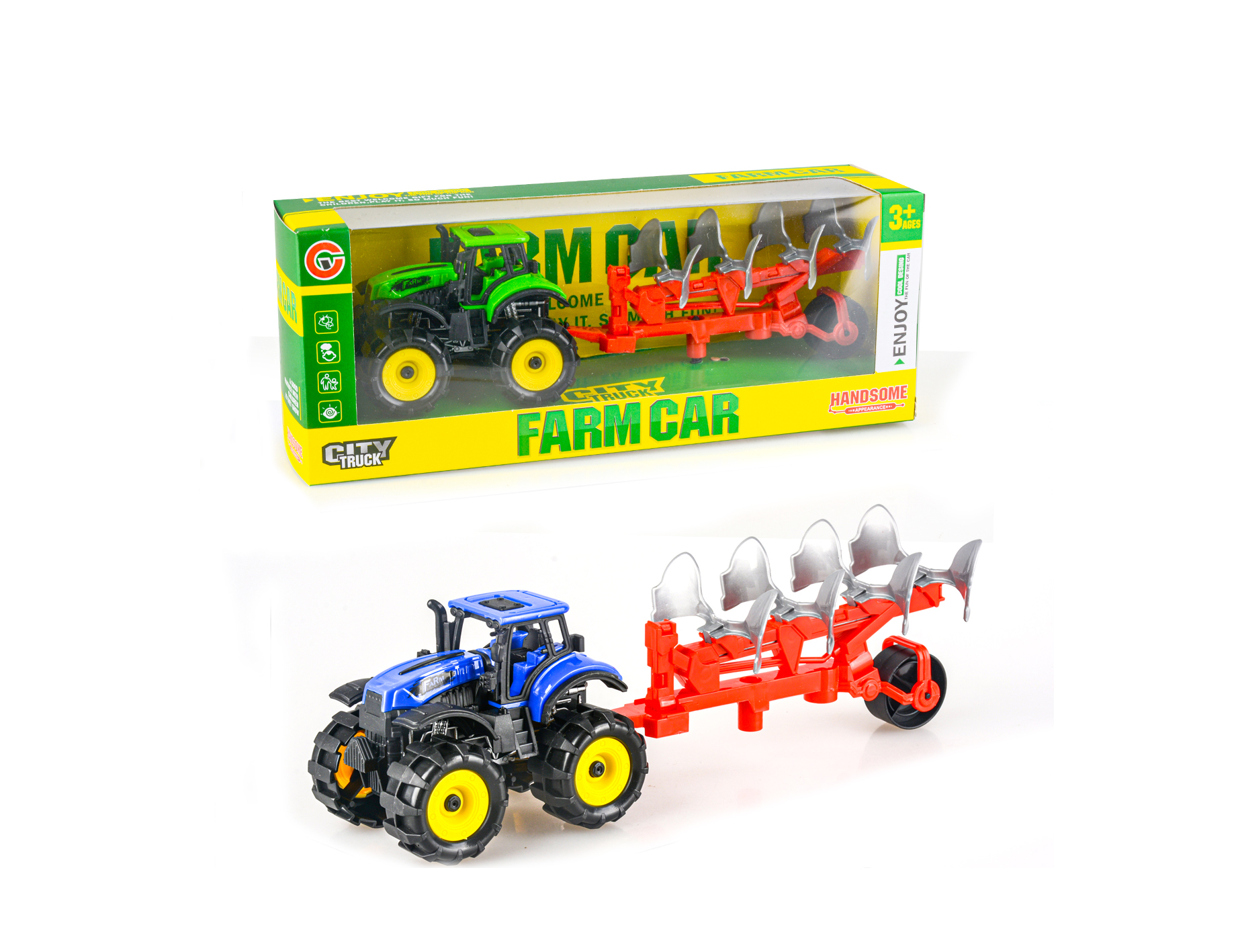 Traktor na setrvačník s pluhem. Rozměry traktoru 25x7x7,5 cm. 2 varianty - modrá, zelená.