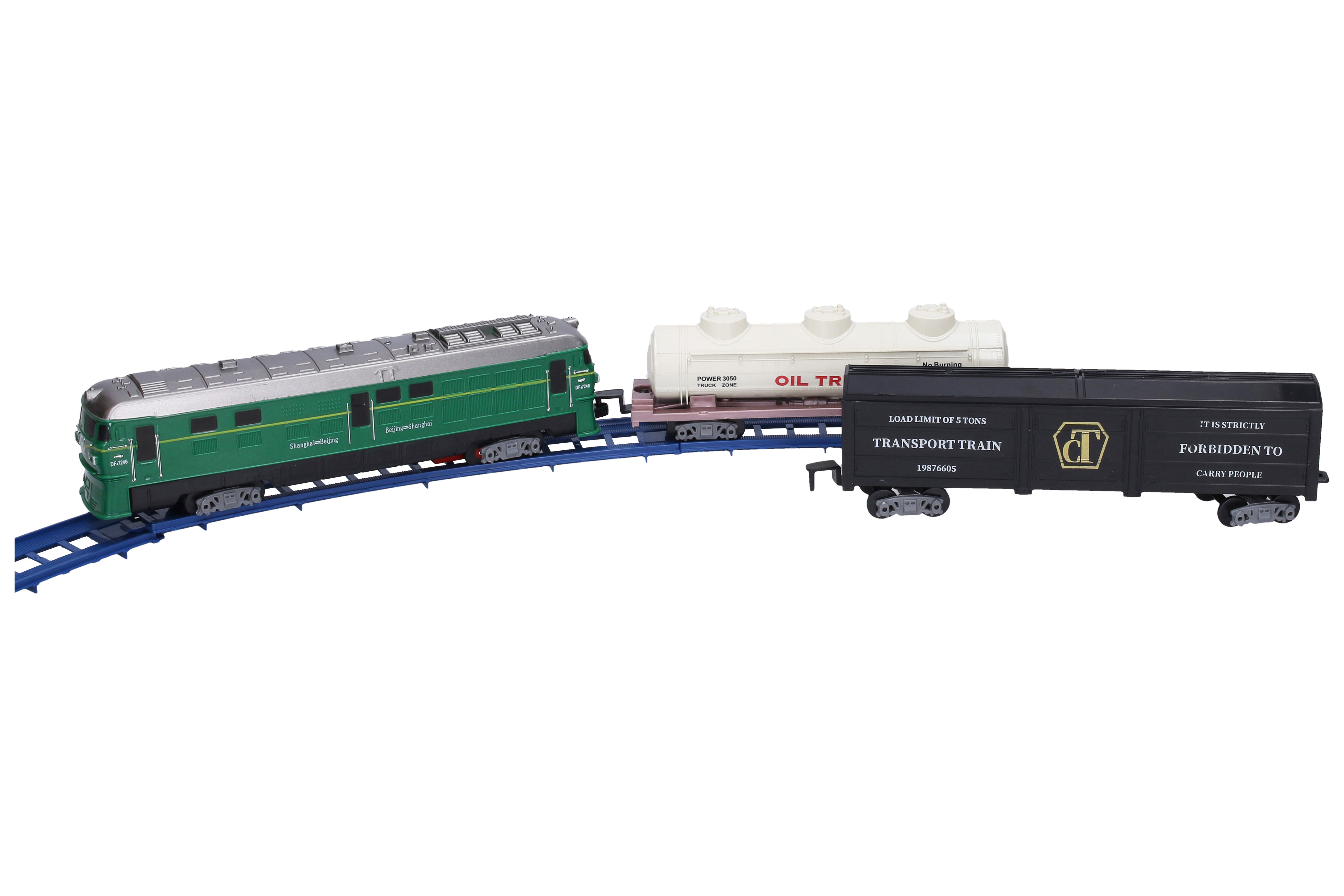 Vlak trať s efekty. Rozměry sestavené trati 106x106 cm. Vydává světelné a zvukové efekty. Schéma spojení vlaků a spojení trati se nachází na obalu. 2xAA baterie, nejsou součástí balení.