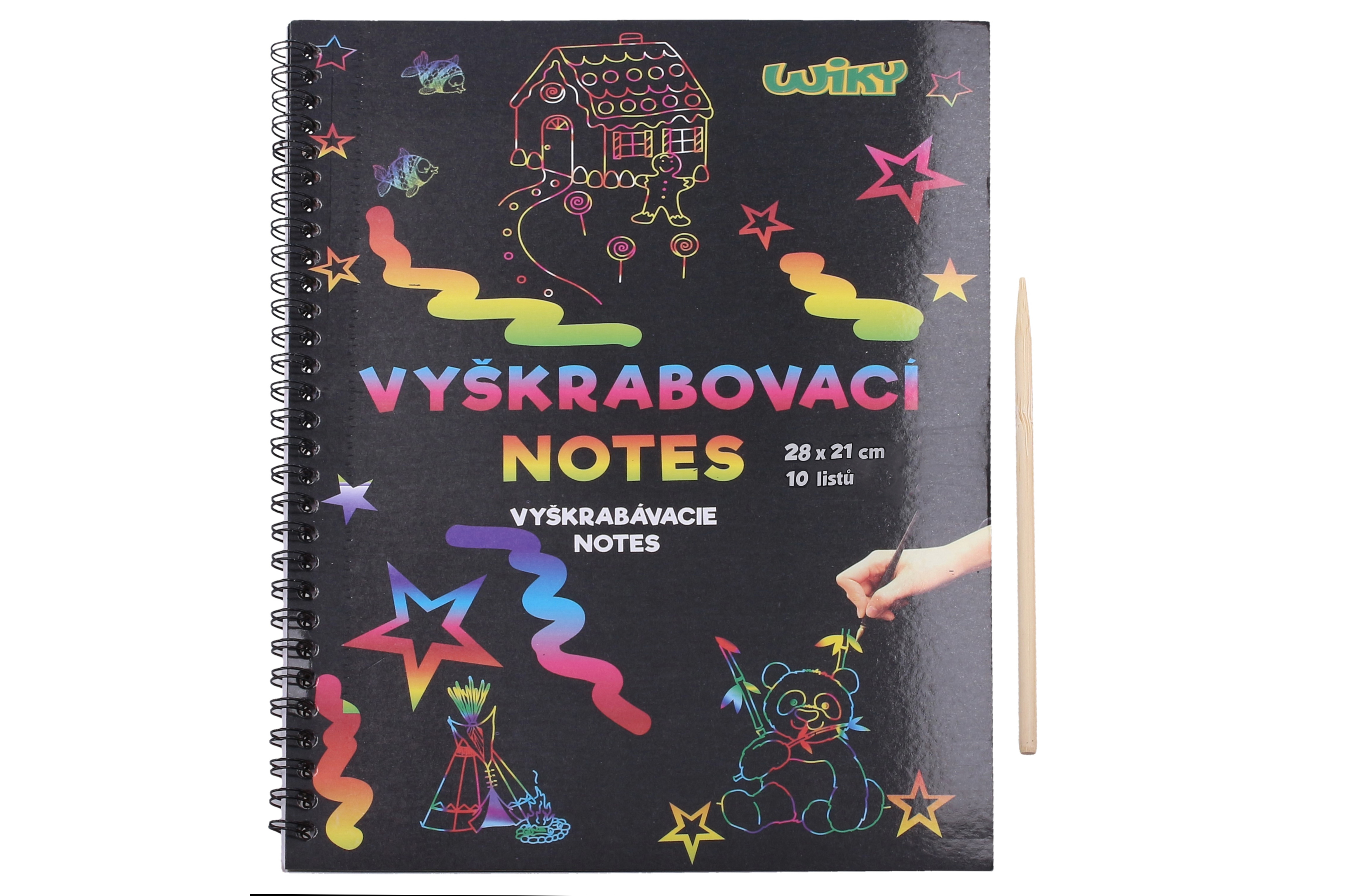 Kreativně se vydovádějte na vyškrabovacím notesu, který má rozměry 19x26 cm. Na jednotlivých listech, můžete pomocí vyškrabovacího pera vytvářet různé pestrobarevné obrázky.