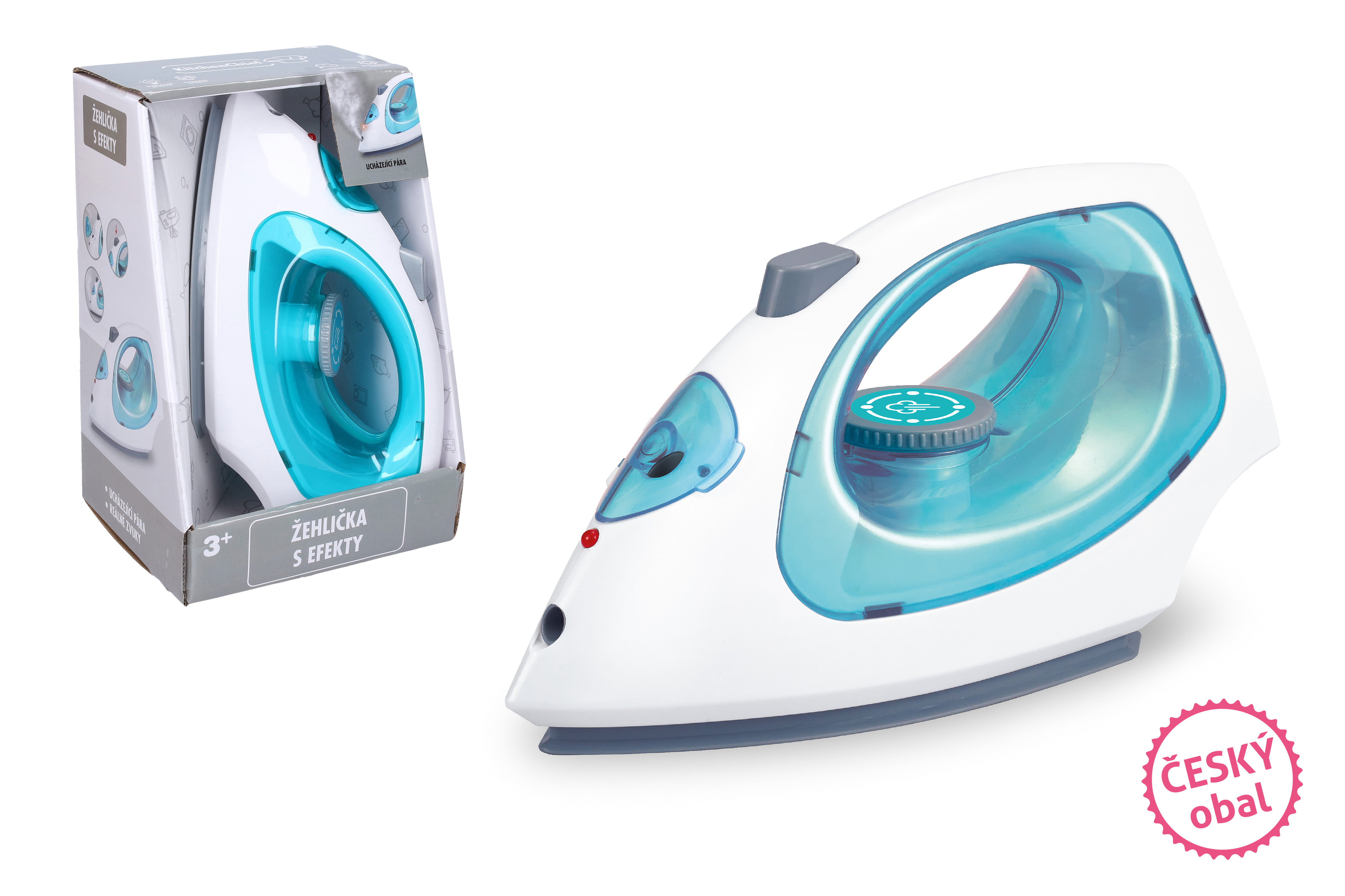 Žehlička s efekty. Velikost 22 cm. Světelné a zvukové efekty. 3xAA baterie nejsou součástí. Lze naplnit vodou, upouští páru po stlačení tlačítka.