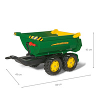 Povišni traktor Rolly Toys Halfpipe John Deere je združljiv dodatek za traktorje, ki širi zabavo za male kmete. Ta veliki in stabilni dvojni osni priklopnik je trpežen in ima dolgo življenjsko dobo. Zaradi praktične funkcije povišanja s pomočjo ročaja lahko otroci enostavno izpraznijo priklopnik in naložijo tovor. Priklopnik Rolly Toys Halfpipe John Deere omogoča otrokom, da so aktivni, preživljajo čas na prostem in hkrati razvijajo motorične sposobnosti. Ne glede na to, ali so na vrtu, na igrišču ali na travniku, bo ta igrača 제공ila ure kreativne zabave. To je odlična priložnost za motivacijo otrok za odkrivanje sveta. Zaradi robustne konstrukcije in kakovostne obdelave je idealna izbira za male pustolovce.